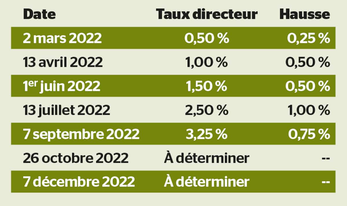 Le 7 septembre 2022 la Banque du Canada a augmenté le taux directeur de 075 pour le porter à 325. En effet nous anticipons une diminution cumulative record denviron 15 à léchelle nationale dici la fin de 2023 supposant un taux directeur qui plafonne autour de 40 et une Banque du Canada qui jette du lest en abaissant les taux en deuxième moitié de 2023. Les changements climatiques et la Banque du Canada.